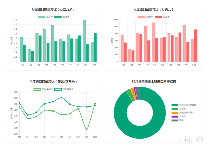 具体来看,2025年10月进口量为1.23万立方米,同比增长44.4%,环比今年9月增长61%;进口金额462万美元,同比增长42.2%。值得注意的是,10月均价同比下降1.5%,为年内首个低于去年同期水平的月份,但环比仍上涨1.1%。