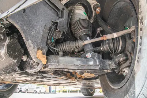 实际测试时,我先把车调到越野模式,空气悬架升高(空悬状态下涉水深度970mm,非空悬状态900mm),缓慢驶入涉水路段。这段路深的地方大概900mm,已经没过了轮毂中心,接近车门下沿,车内完全没有进水的迹象。行驶过程中,发动机动力输出很稳定,没有出现顿挫或动力中断,变速箱换挡也很平顺,完全不像在水中行驶。