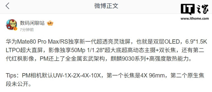 IT之家11月24日消息,博主@数码闲聊站今日爆料,华为Mate80ProMax/RS独享新一代超透亮灵珑屏,也就是双层OLED安徽股票配资,6.9"1.5KLTPO超大直屏,影像独享50Mp1/1.28"超大底超高动态主摄+双长焦,还有第二代红枫影像,PM还上了全金属玄武架构,麒麟9030系列+高强度散热能力。