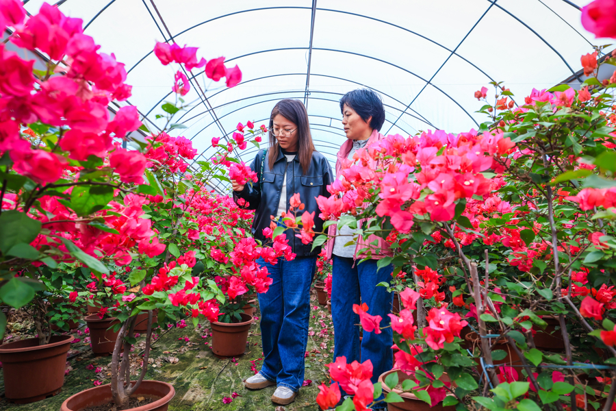 近日,松江区泖港镇焦家村的三角梅种植基地玫红、粉白的花簇缀满枝头,成田间的亮丽风景线。